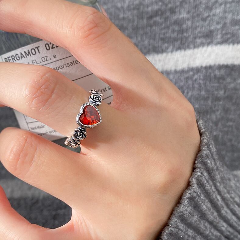 シルバー925 レトロ 燻し ローズ バラ レッドハート 指輪 リング フリーサイズ 金属アレルギー対応
