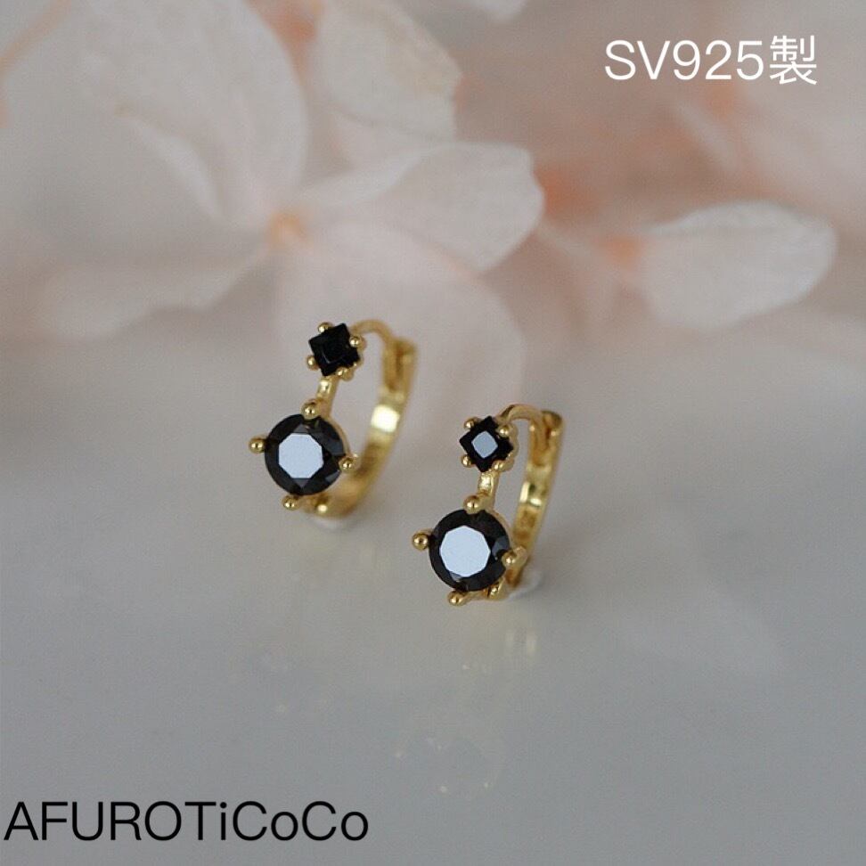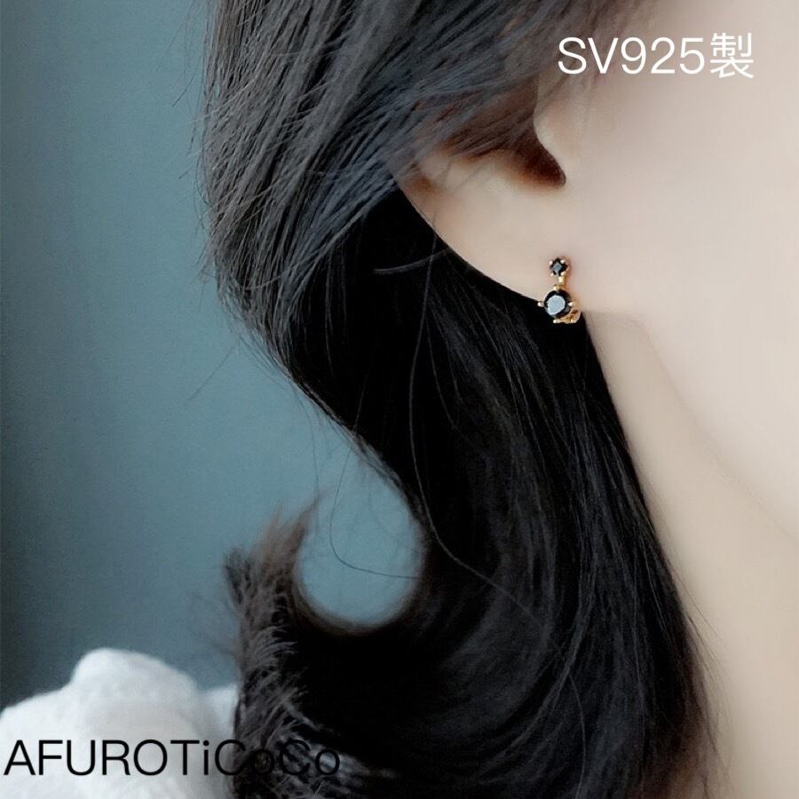 シルバー925 大人かわいい ブラックカラー CZダイヤ フープ ピアス silver925 ピアス セカンドピアス 金属アレルギー対応 重ねつけ