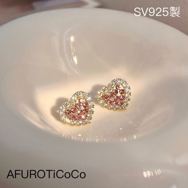 シルバー925 華やかな ピンクハート ピアス silver925 キラキラ セカンドピアス 金属アレルギー対応 重ねつけ