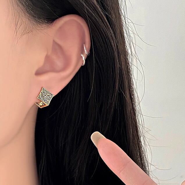 シルバー925 小ぶり 唐草模様 スクエア フープピアス つけっぱなし ピアス 金属アレルギー対応 小さめ セカンドピアス 重ねつけ